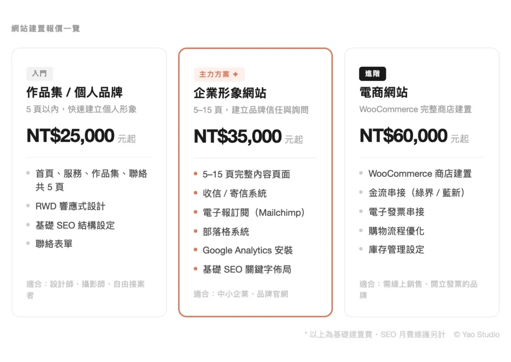 A:基礎報價通常包含:網站建置費用(依類型,如上表)、網域費用(約 NT$300–500/年)、主機費用(約 NT$1,000–1,500/年)、基礎 SEO 結構設定。