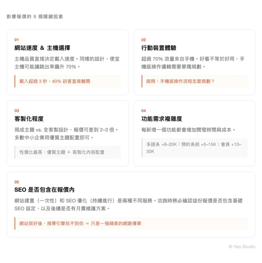 很多業主不理解為什麼「同樣是一個網站」,報價差了兩倍。以下是真正影響成本的因素。